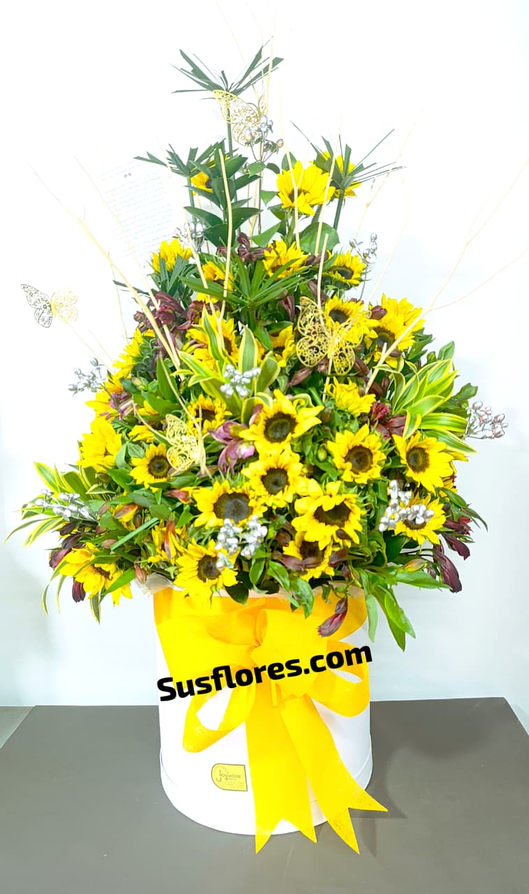 Diseño floral grande de 145cm. con Girasoles y Astromelias con toques delicados con mariposas follajes y complementos.