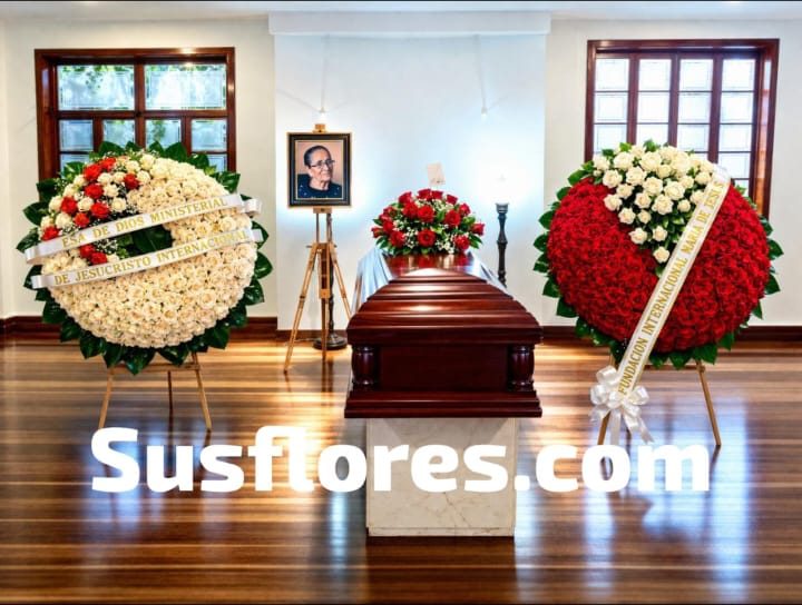 Hermosos Diseños Premium de Coronas fúnebres elaboradas por decoradores florales, con flores de los cultivos de la sabana de primera calidad, tipo exportación y cintas marcadas con el remitente y mensaje de condolencias.